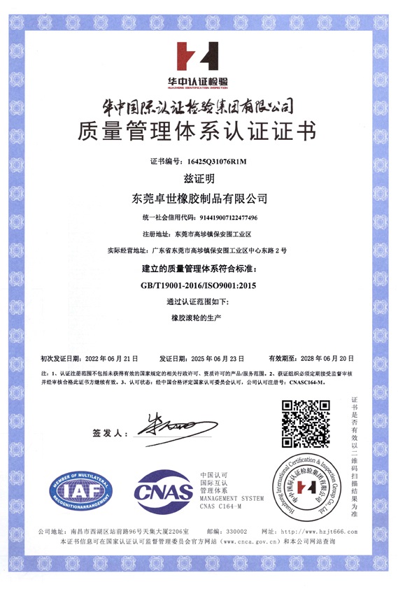 常熟卓世以科学人性化的管理、专业的技术团队、创新的研发理念、优良的服务品质、贴心的专业服务、精英业务销售团队,赢得同行业内和客户的一致认可,在国内胶辊行业中已成为最专业的胶辊生产厂家并已成为胶辊行业内屈指可数的名牌,卓世人一直以质量求生存、以信誉求发展、以优质的服务为宗旨,且通过努力成功获得质量体系ISO9001:2015/16质量管理体系认证,并以确保客户“买了放心、用了安心、生产有信心”。